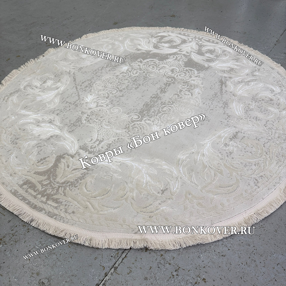 Изящный Белый Круглый Ковер Для Гостиной Медальон Дизайн 30533 наполняет интерьер гостиной теплом и уютом, гармонично сочетает в себе изящество и красоту. Он изготовлен из высококачественных материалов, комфортный и долговечный.