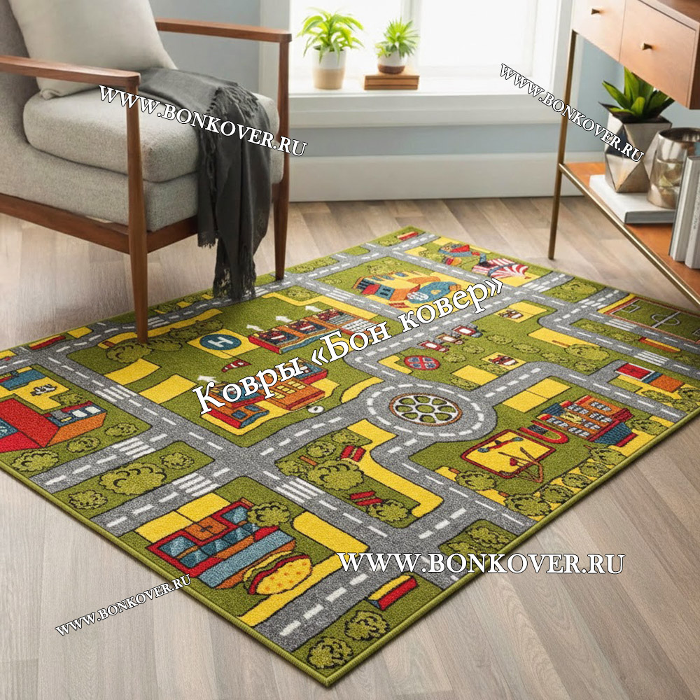 Детский Ковер Город 02 Зеленый не деформируется, сохраняет свою форму. Ворс легко восстанавливается, что не оставляет на поверхности изделия неприглядных отметин.